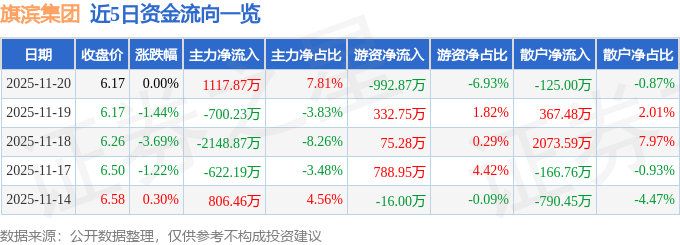 证券之星消息,截至2025年11月20日收盘,旗滨集团(601636)报收于6.17元,上涨0.0%,换手率0.83%,成交量23.15万手,成交额1.43亿元。