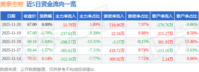 证券之星消息,截至2025年11月20日收盘,奥泰生物(688606)报收于67.0元,上涨0.0%,换手率0.52%,成交量4122.0手,成交额2746.34万元。