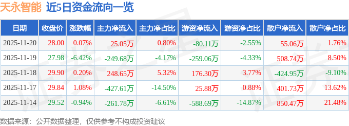 证券之星消息,截至2025年11月20日收盘,天永智能(603895)报收于28.0元,上涨0.07%,换手率1.03%,成交量1.11万手,成交额3136.52万元。