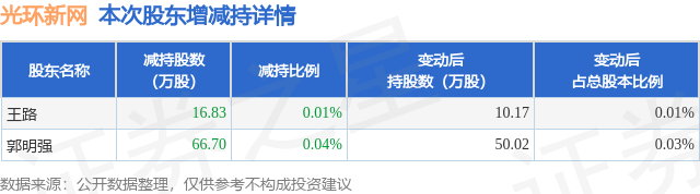 证券之星消息,11月20日光环新网发布公告《光环新网:关于控股股东一致行动人减持计划实施完成的公告》,其股东王路、郭明强于2025年9月4日至2025年11月19日间合计减持83.53万股,占公司目前总股本的0.0465%,变动期间该股股价下跌12.32%,截止11月19日收盘报13.02元。