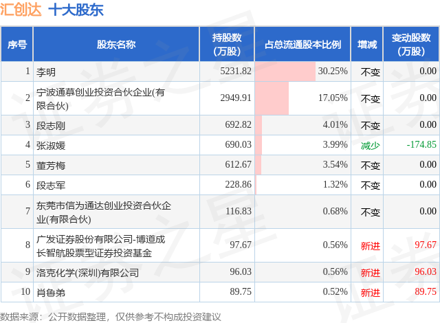 根据汇创达2025年三季报公布的十大股东详情如下: