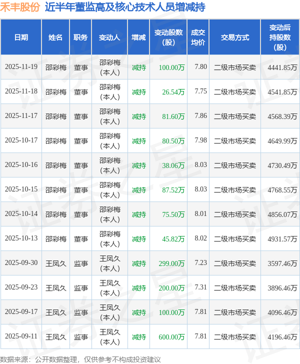 禾丰股份近半年内的董监高及核心技术人员增减持详情如下: