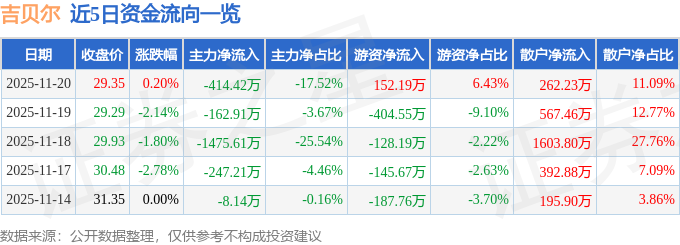11月20日的资金流向数据方面,主力资金净流出414.42万元,占总成交额17.52%,游资资金净流入152.19万元,占总成交额6.43%,散户资金净流入262.23万元,占总成交额11.09%。