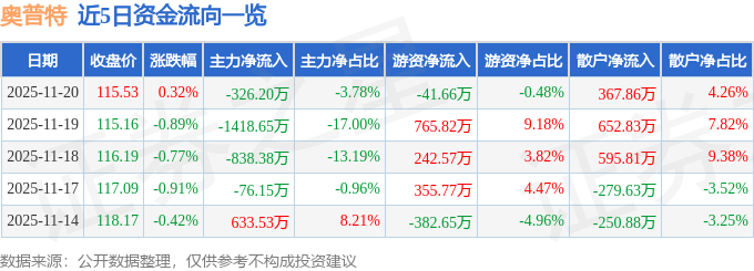 11月20日的资金流向数据方面,主力资金净流出326.2万元,占总成交额3.78%,游资资金净流出41.66万元,占总成交额0.48%,散户资金净流入367.86万元,占总成交额4.26%。