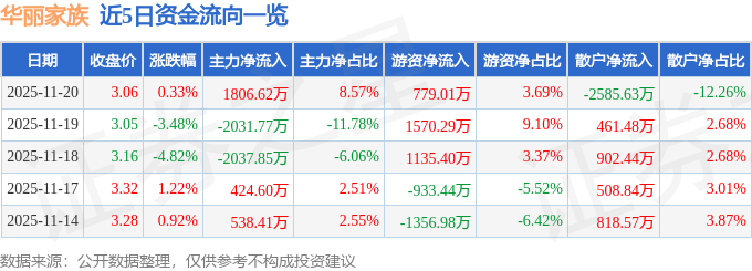 证券之星消息,截至2025年11月20日收盘,华丽家族(600503)报收于3.06元,上涨0.33%,换手率4.23%,成交量67.83万手,成交额2.11亿元。
