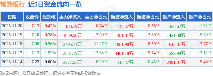 证券之星消息,截至2025年11月20日收盘,常熟银行(601128)报收于7.13元,上涨0.42%,换手率1.05%,成交量34.78万手,成交额2.49亿元。
