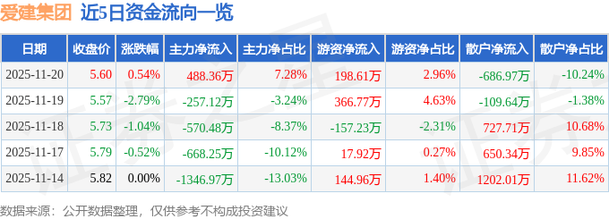 证券之星消息,截至2025年11月20日收盘,爱建集团(600643)报收于5.6元,上涨0.54%,换手率0.75%,成交量12.0万手,成交额6708.3万元。