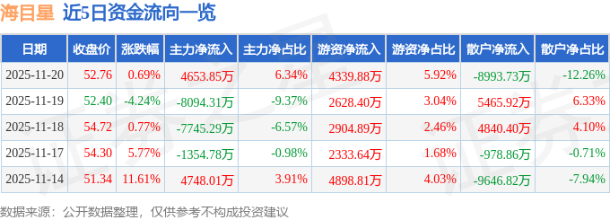 证券之星消息,截至2025年11月20日收盘,海目星(688559)报收于52.76元,上涨0.69%,换手率5.51%,成交量13.65万手,成交额7.34亿元。
