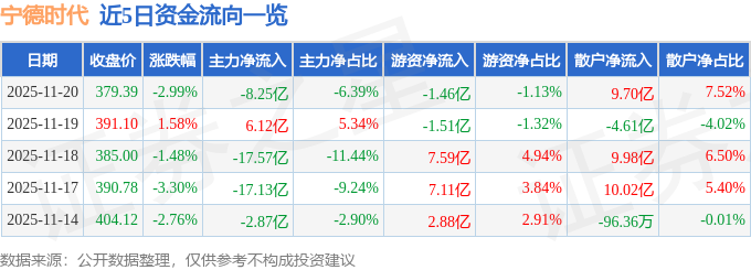 证券之星消息,截至2025年11月20日收盘,宁德时代(300750)报收于379.39元,下跌2.99%,换手率0.79%,成交量33.67万手,成交额128.95亿元。