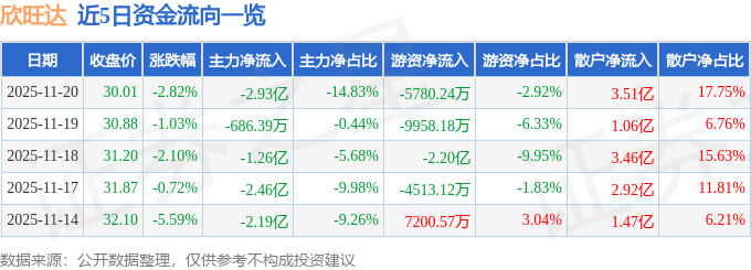 11月20日的资金流向数据方面,主力资金净流出2.93亿元,占总成交额14.83%,游资资金净流出5780.24万元,占总成交额2.92%,散户资金净流入3.51亿元,占总成交额17.75%。
