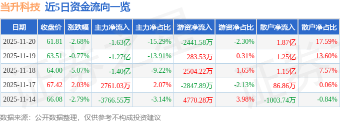 证券之星消息,截至2025年11月20日收盘,当升科技(300073)报收于61.81元,下跌2.68%,换手率3.34%,成交量16.91万手,成交额10.64亿元。