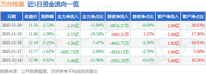 证券之星消息,截至2025年11月20日收盘,万向钱潮(000559)报收于11.56元,下跌2.53%,换手率2.62%,成交量86.84万手,成交额10.15亿元。