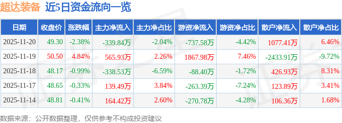 证券之星消息,截至2025年11月20日收盘,超达装备(301186)报收于49.3元,下跌2.38%,换手率4.45%,成交量3.36万手,成交额1.67亿元。