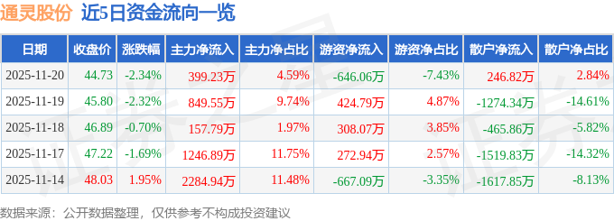 证券之星消息,截至2025年11月20日收盘,通灵股份(301168)报收于44.73元,下跌2.34%,换手率2.03%,成交量1.93万手,成交额8693.72万元。