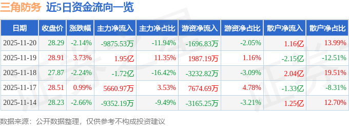 证券之星消息,截至2025年11月20日收盘,三角防务(300775)报收于28.29元,下跌2.14%,换手率5.48%,成交量29.15万手,成交额8.27亿元。