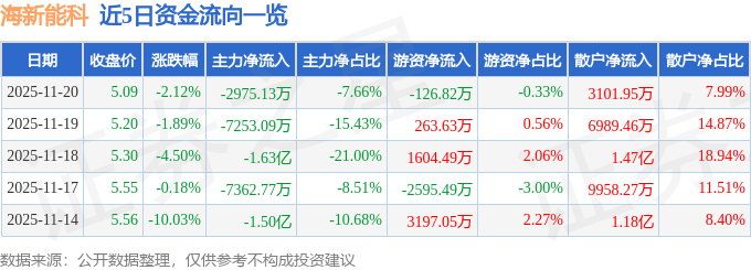 证券之星消息,截至2025年11月20日收盘,海新能科(300072)报收于5.09元,下跌2.12%,换手率3.23%,成交量75.19万手,成交额3.88亿元。