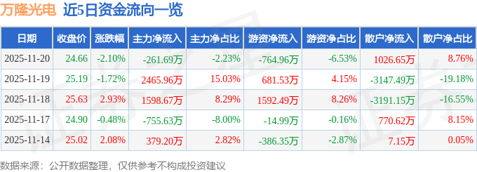 证券之星消息,截至2025年11月20日收盘,万隆光电(300710)报收于24.66元,下跌2.1%,换手率6.31%,成交量4.71万手,成交额1.17亿元。