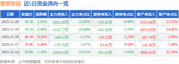 证券之星消息,截至2025年11月20日收盘,雷赛智能(002979)报收于38.3元,下跌2.05%,换手率1.56%,成交量3.46万手,成交额1.34亿元。