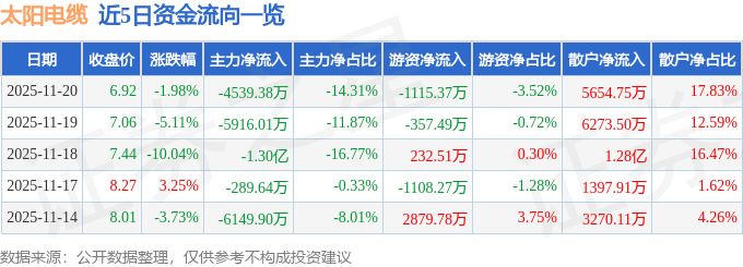 证券之星消息,截至2025年11月20日收盘,太阳电缆(002300)报收于6.92元,下跌1.98%,换手率6.27%,成交量45.26万手,成交额3.17亿元。