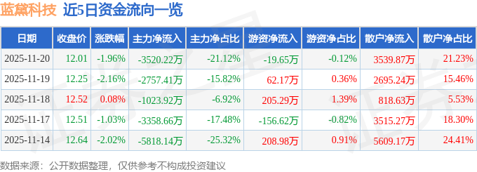 证券之星消息,截至2025年11月20日收盘,蓝黛科技(002765)报收于12.01元,下跌1.96%,换手率2.31%,成交量13.76万手,成交额1.67亿元。