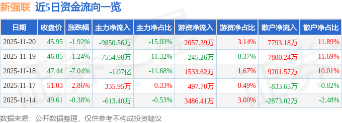 证券之星消息,截至2025年11月20日收盘,新强联(300850)报收于45.95元,下跌1.92%,换手率4.69%,成交量14.1万手,成交额6.56亿元。