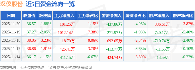 证券之星消息,截至2025年11月20日收盘,汉仪股份(301270)报收于36.57元,下跌1.88%,换手率2.53%,成交量2.39万手,成交额8822.79万元。