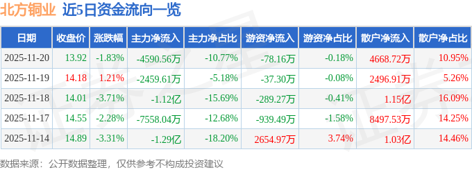 证券之星消息,截至2025年11月20日收盘,北方铜业(000737)报收于13.92元,下跌1.83%,换手率1.59%,成交量30.25万手,成交额4.26亿元。