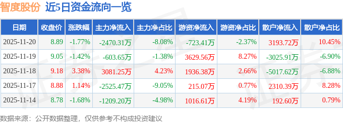 证券之星消息,截至2025年11月20日收盘,智度股份(000676)报收于8.89元,下跌1.77%,换手率2.71%,成交量34.21万手,成交额3.06亿元。