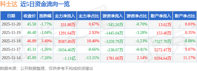 证券之星消息,截至2025年11月20日收盘,科士达(002518)报收于45.58元,下跌1.77%,换手率1.88%,成交量10.62万手,成交额4.92亿元。