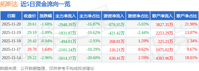 证券之星消息,截至2025年11月20日收盘,拓斯达(300607)报收于28.61元,下跌1.68%,换手率1.83%,成交量6.06万手,成交额1.75亿元。