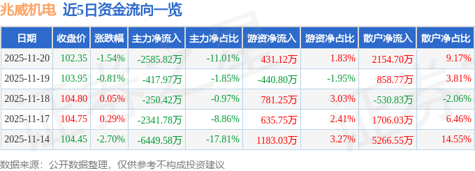 证券之星消息,截至2025年11月20日收盘,兆威机电(003021)报收于102.35元,下跌1.54%,换手率1.1%,成交量2.28万手,成交额2.35亿元。