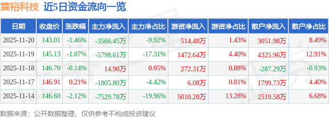 证券之星消息,截至2025年11月20日收盘,震裕科技(300953)报收于143.01元,下跌1.46%,换手率2.0%,成交量2.5万手,成交额3.6亿元。