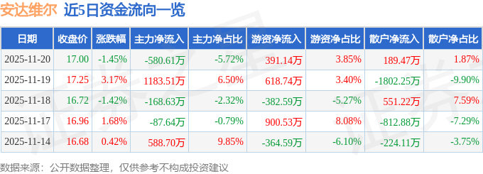 证券之星消息,截至2025年11月20日收盘,安达维尔(300719)报收于17.0元,下跌1.45%,换手率3.31%,成交量5.95万手,成交额1.02亿元。