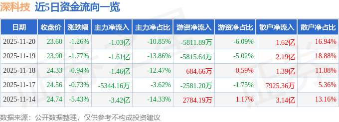 证券之星消息,截至2025年11月20日收盘,深科技(000021)报收于23.6元,下跌1.26%,换手率2.54%,成交量39.95万手,成交额9.54亿元。