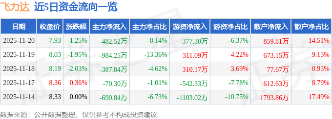 证券之星消息,截至2025年11月20日收盘,飞力达(300240)报收于7.93元,下跌1.25%,换手率2.05%,成交量7.45万手,成交额5927.09万元。