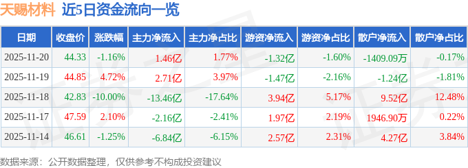 证券之星消息,截至2025年11月20日收盘,天赐材料(002709)报收于44.33元,下跌1.16%,换手率12.18%,成交量179.33万手,成交额82.79亿元。