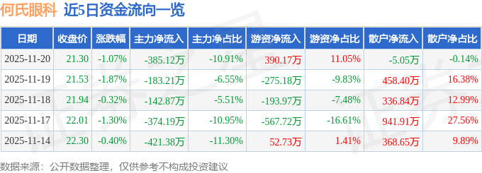 证券之星消息,截至2025年11月20日收盘,何氏眼科(301103)报收于21.3元,下跌1.07%,换手率1.05%,成交量1.66万手,成交额3530.43万元。
