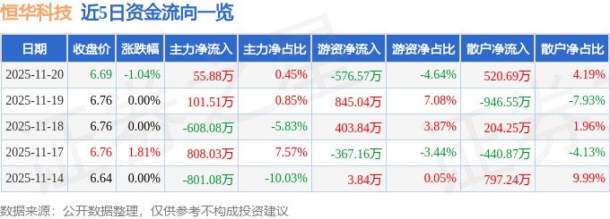 证券之星消息,截至2025年11月20日收盘,恒华科技(300365)报收于6.69元,下跌1.04%,换手率3.63%,成交量18.56万手,成交额1.24亿元。