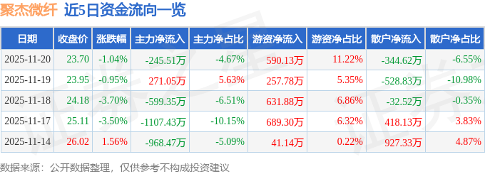 证券之星消息,截至2025年11月20日收盘,聚杰微纤(300819)报收于23.7元,下跌1.04%,换手率1.64%,成交量2.21万手,成交额5258.17万元。