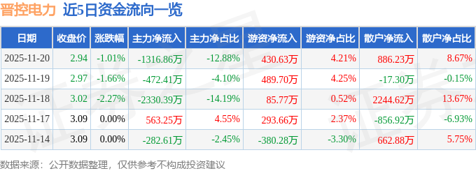 证券之星消息,截至2025年11月20日收盘,晋控电力(000767)报收于2.94元,下跌1.01%,换手率1.19%,成交量34.6万手,成交额1.02亿元。