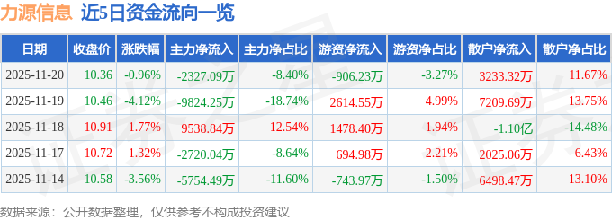 证券之星消息,截至2025年11月20日收盘,力源信息(300184)报收于10.36元,下跌0.96%,换手率2.53%,成交量26.49万手,成交额2.77亿元。