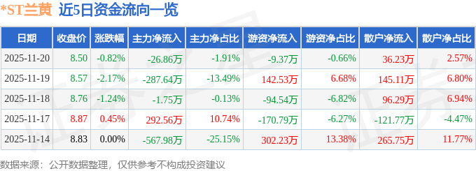 证券之星消息,截至2025年11月20日收盘,*ST兰黄(000929)报收于8.5元,下跌0.82%,换手率0.89%,成交量1.65万手,成交额1409.23万元。