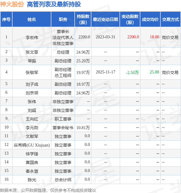 证券之星消息,根据11月20日市场公开信息、上市公司公告及交易所披露数据整理,神火股份(000933)最新董监高及相关人员股份变动情况:2025年11月19日公司高管张敬军共减持公司股份2.0万股,占公司总股本为0.0009%。变动期间公司股价上涨1.83%,11月19日当日收盘报25.1元。