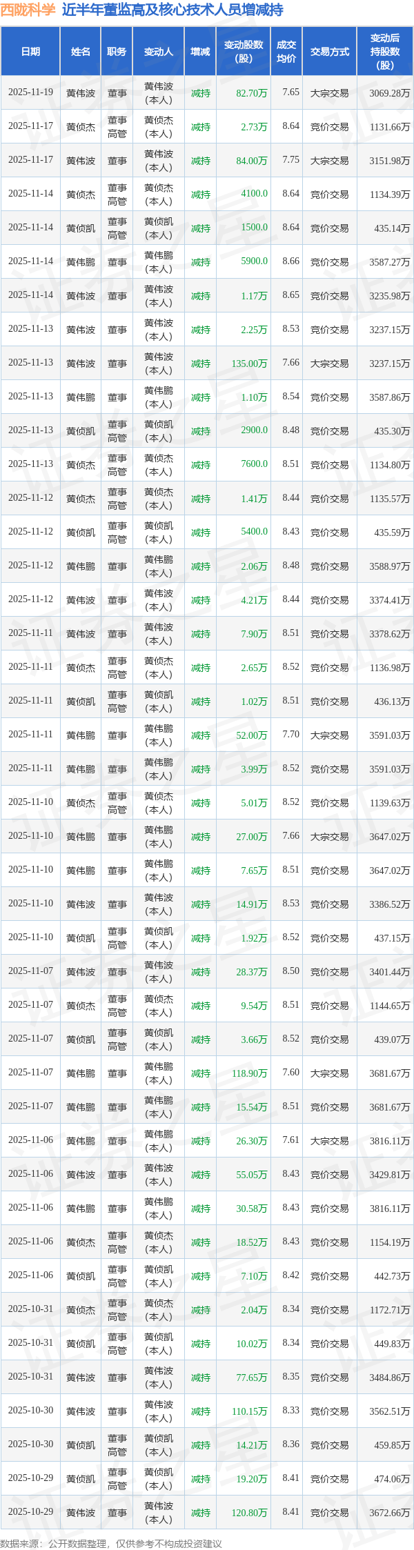 西陇科学近半年内的董监高及核心技术人员增减持详情如下: