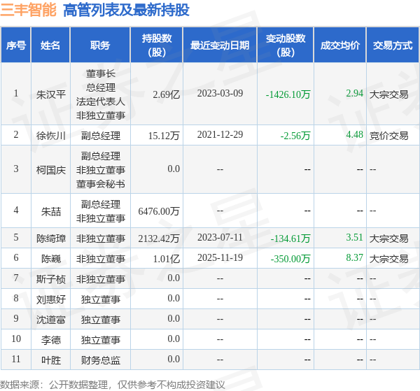 三丰智能的高管列表及最新持股情况如下: