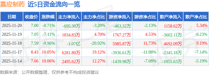 证券之星消息,截至2025年11月20日收盘,嘉应制药(002198)报收于7.0元,下跌0.71%,换手率6.06%,成交量30.75万手,成交额2.17亿元。