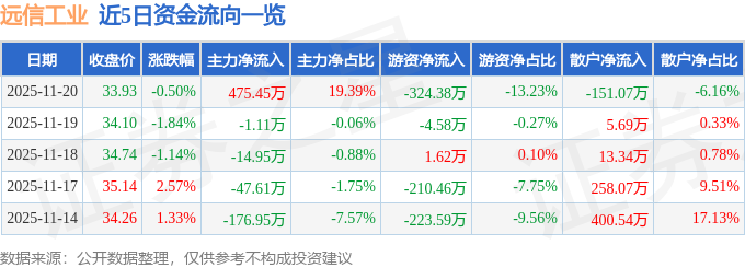 证券之星消息,截至2025年11月20日收盘,远信工业(301053)报收于33.93元,下跌0.5%,换手率0.93%,成交量7190.0手,成交额2452.27万元。