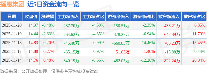 证券之星消息,截至2025年11月20日收盘,播恩集团(001366)报收于14.37元,下跌0.48%,换手率7.97%,成交量4.44万手,成交额6397.43万元。