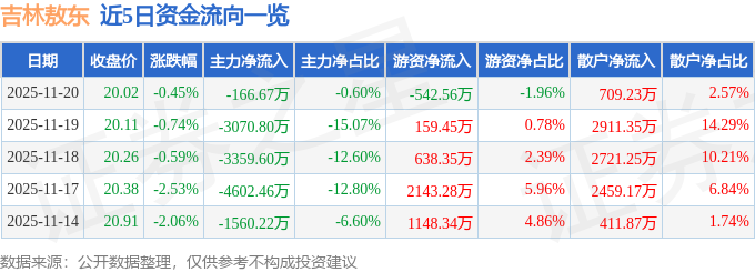 证券之星消息,截至2025年11月20日收盘,吉林敖东(000623)报收于20.02元,下跌0.45%,换手率1.15%,成交量13.64万手,成交额2.76亿元。