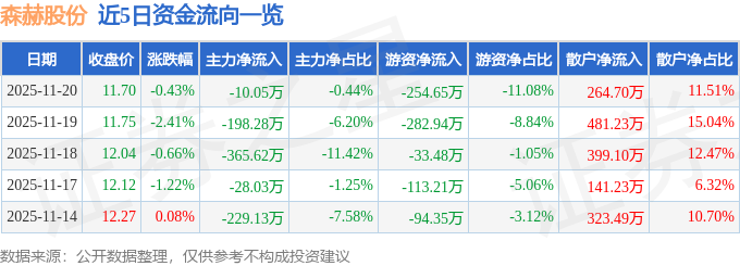 证券之星消息,截至2025年11月20日收盘,森赫股份(301056)报收于11.7元,下跌0.43%,换手率1.11%,成交量1.96万手,成交额2298.78万元。